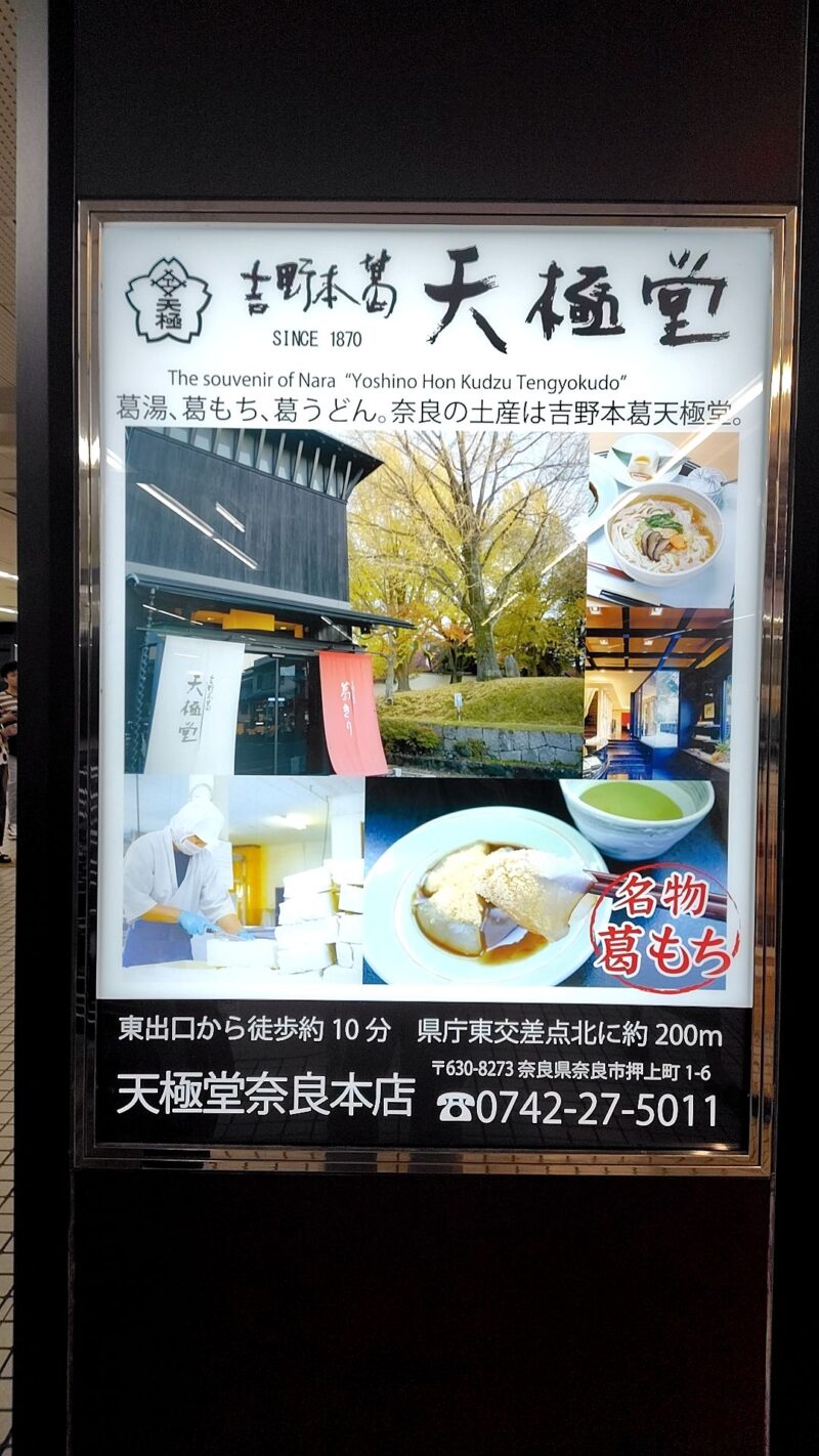吉野本くず「天極堂」の広告: 艶やかな葛餅の写真が目を引き、思わずお腹が鳴ってしまいそうに……。
