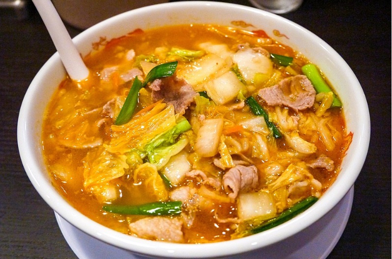 運ばれてきた一杯は、ニンニクの香りが食欲を刺激する真っ赤なスープ! ひと口食べると、ピリッとした刺激的な辛さが広がります。ところが、不思議なことに炒めた白菜やニラの甘みがスープに溶け出していて、後味はとてもまろやか。