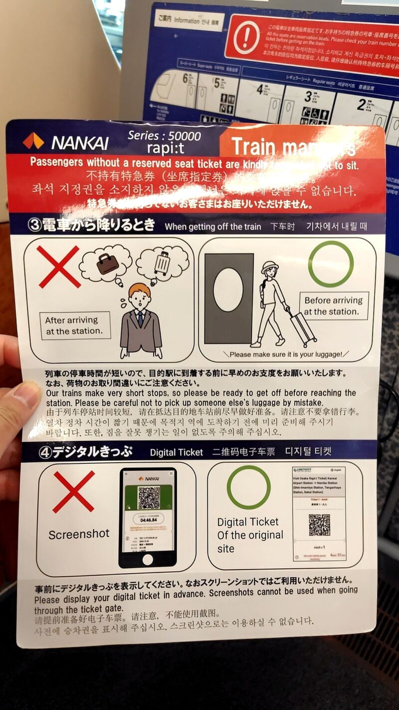 多言語対応のきめ細やかさ 座席には、注意事項が書かれたチラシが備え付けられています。英語をはじめとする外国語表記が充実しており、インバウンドのお客様も安心して利用できる配慮が随所に感じられました。